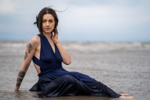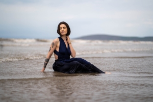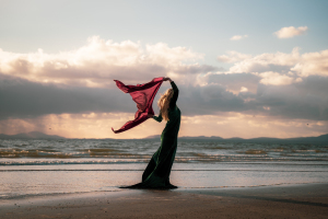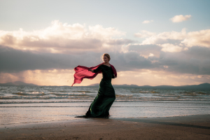 Sesja fotograficzna na plaży w świetle zachodzącego słońca - wiatr, zwiewna sukienka i magia chwili uchwycona w naturalnych, pełnych emocji kadrach.📸